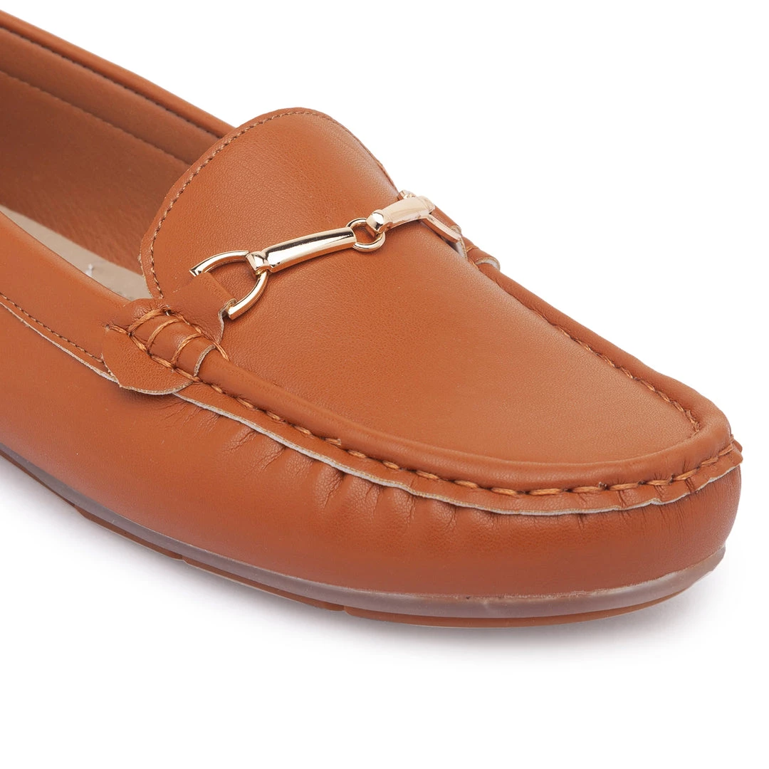 Add a classic touch to the season with the Sandra Tan Loafers. This footwear comes with detailed golden embellishment and a tan monotone. Perfect to pair with any attire, the loafer personifies comfort.
