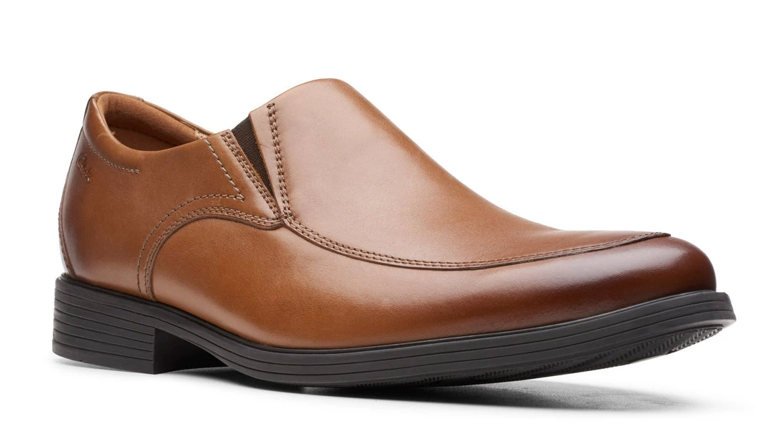 Full grain dark tan leather Whiddon Step with its burnished apron toe and flexible elastic gores brings together professional dress appeal with an easy, slip-on fit. Its moisture-wicking OrthoLite® footbed reduces impact shock and keeps feet fresh in Ultimate Comfort.