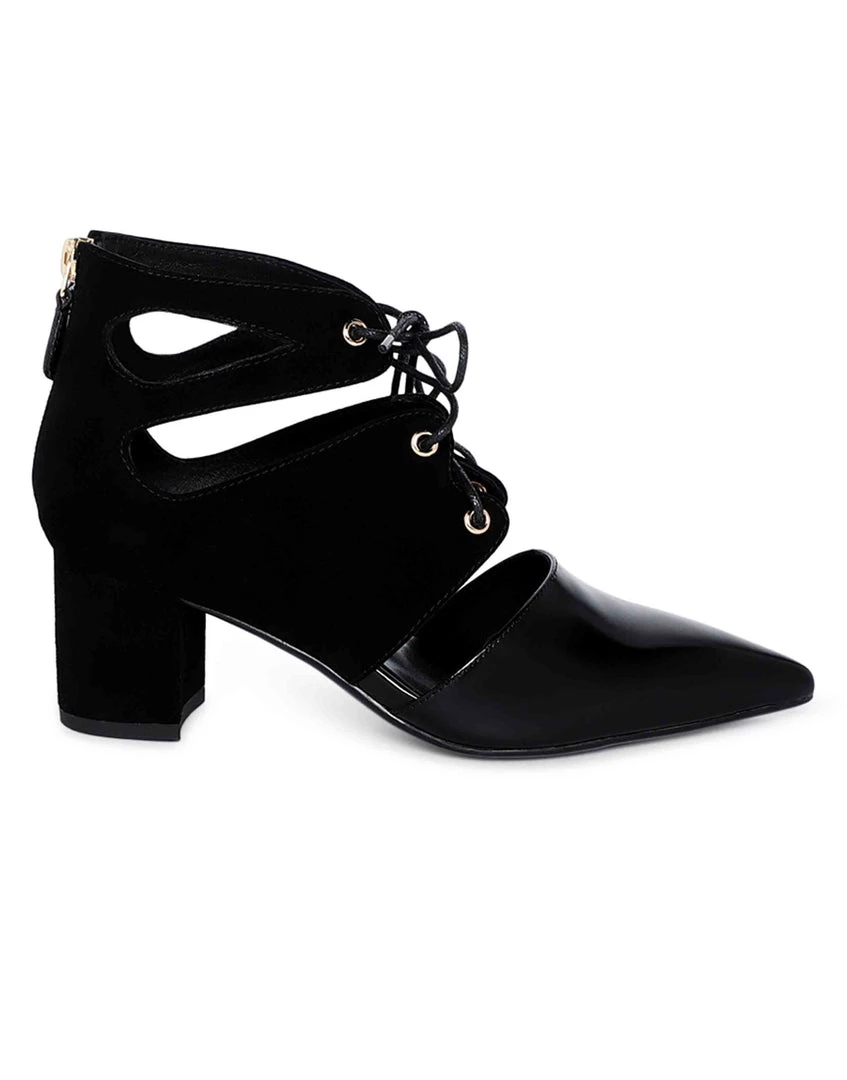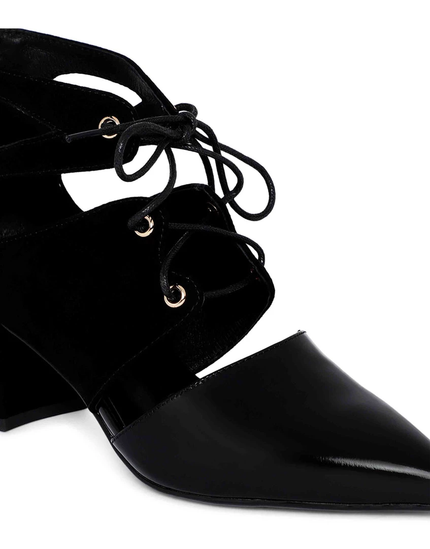 A smart look for transitioning flawlessly between seasons, this sandal-bootie features an intricate cutout design with lace-ups at the shield and a modern, stacked block heel.