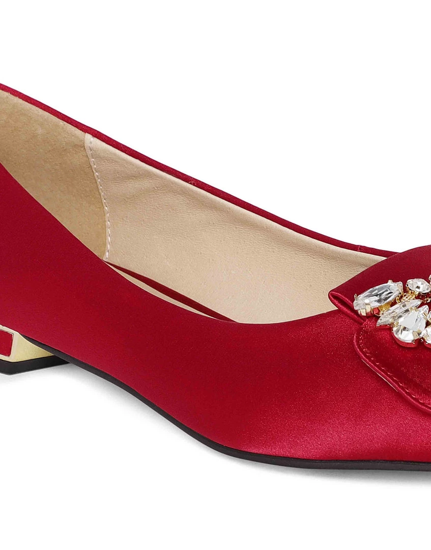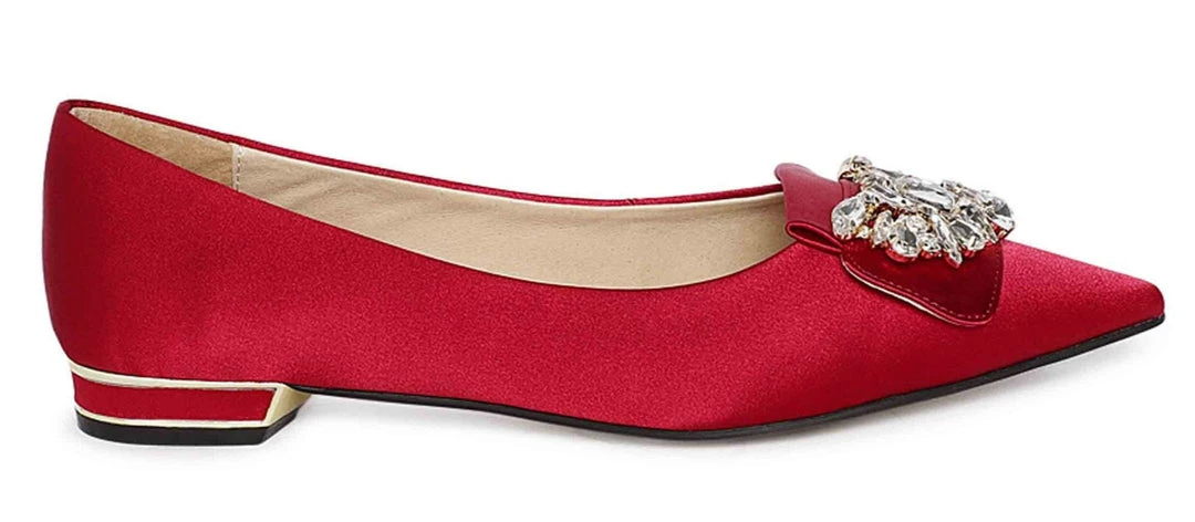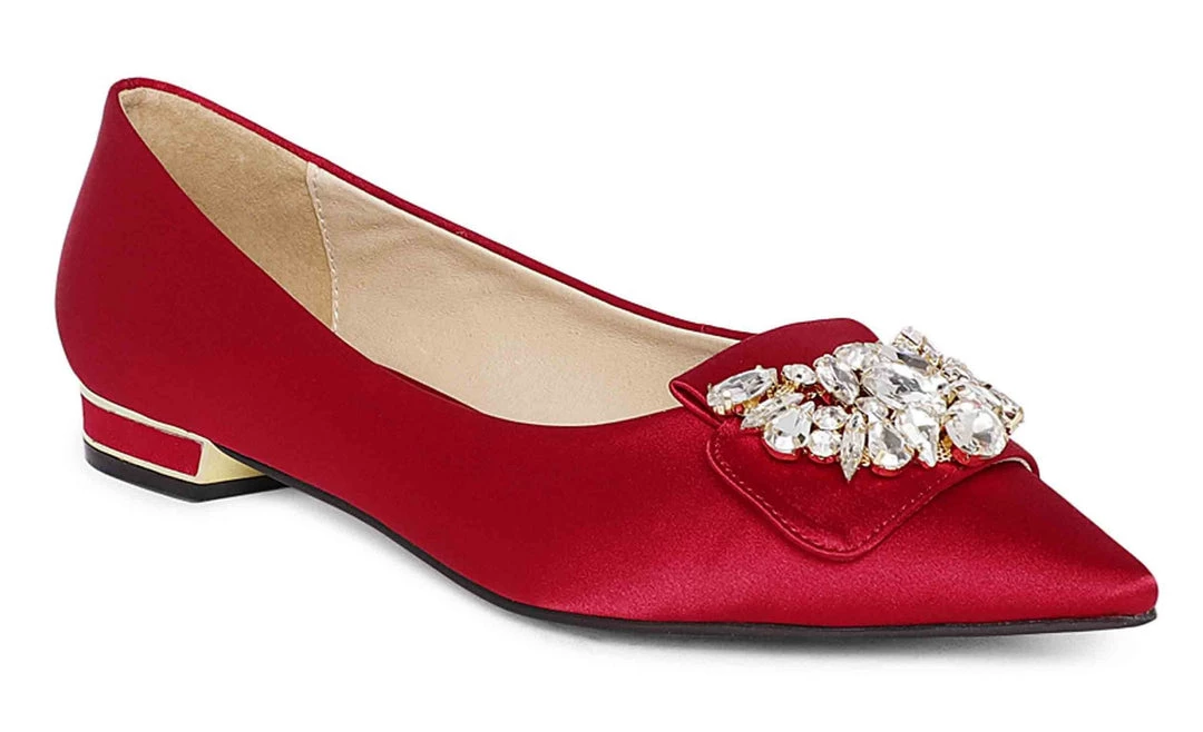 This occasion-ready pointed-toed ballerina will indulge your whole attire in a touch of timelessly regal elegance.Sspotted with crystals on the vamp, wear them with a flowly gown for that feminine touch