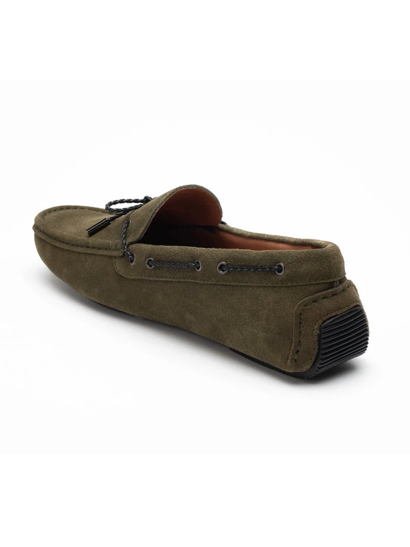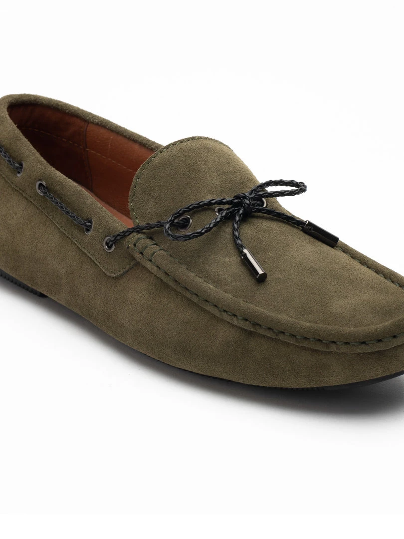 This pair of olive driving moccassins go perfectly with a pair of shorts or denim. The black detailing gives it a personality enhancement. Casual level 1000%.