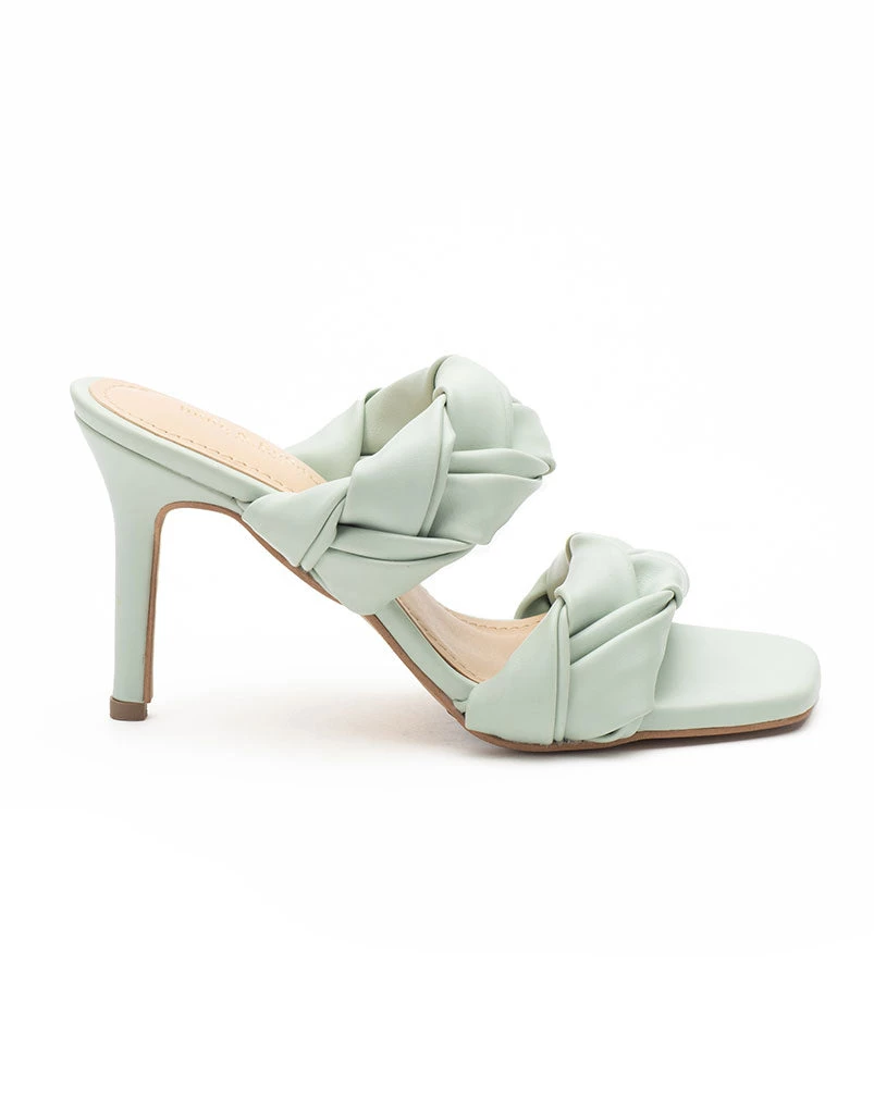 “For comfort-loving fashionable you, these braided leather stilettos are just the right fit. Designed to beautifully coil around your feet, pair these Mint green beauties with short dresses, long feminine maxis or denim & crops. “