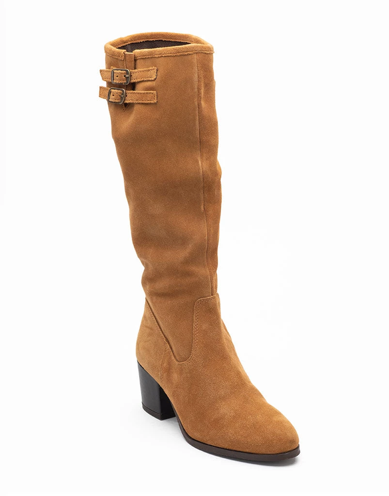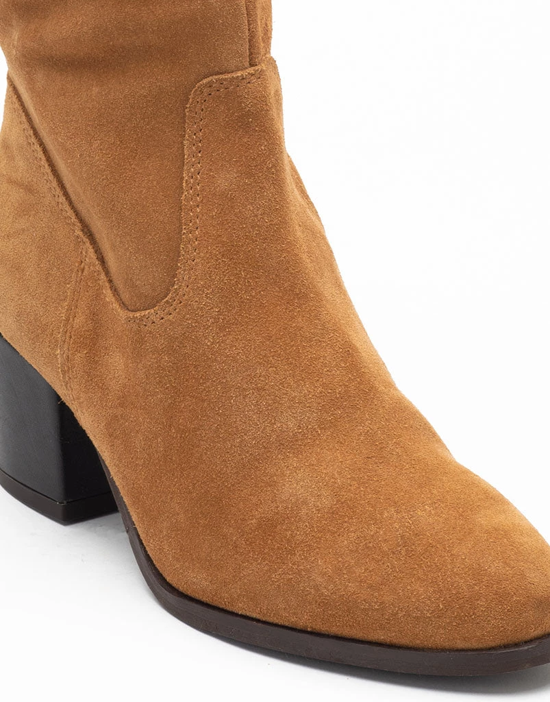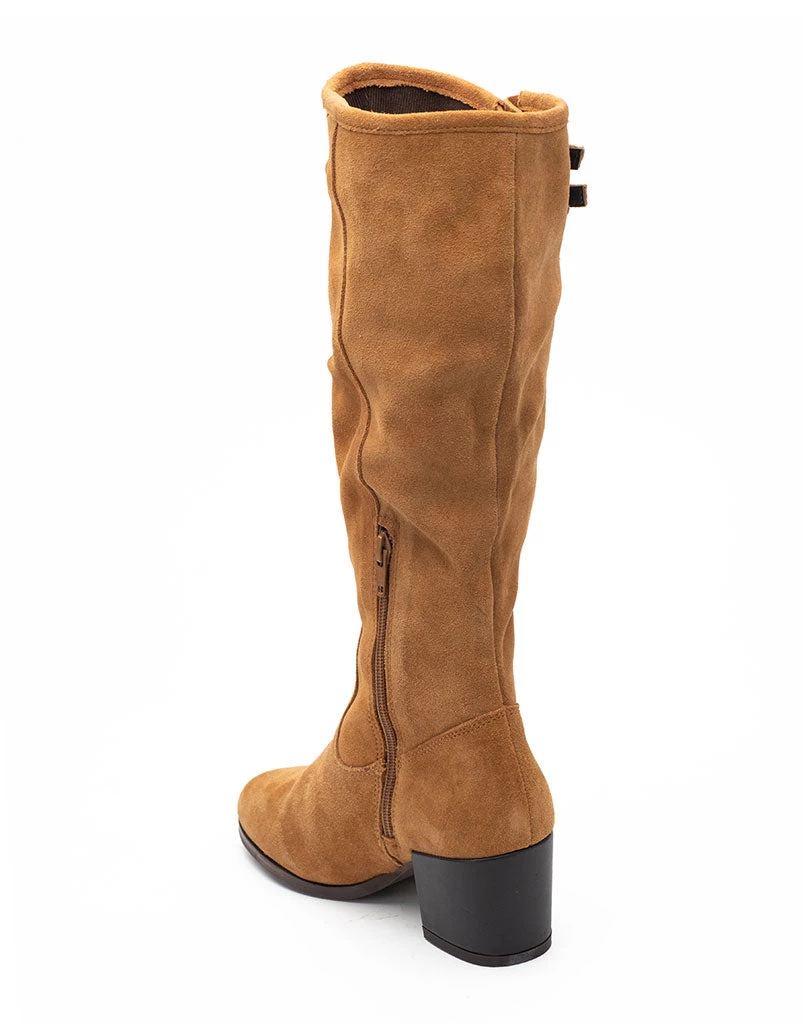 A knee length silhouette in soft suede, stacked on a steardy block heel is sure to turn heads! These tan booties stand for Celebrating flair and fun in a distinct style & walk you through cold weather in poise.
