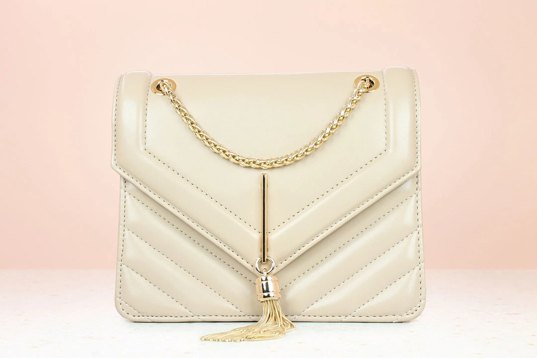 A sling bag that’s spacious and stylish? Yes. It’s a pleasant surprise. This sling bag has more than enough space because of its squarish shape. It has a fancy belt with a golden chain. A closing flap with some delicate tassels on it. The beautiful Beige colour makes it look very classy. It’s very reasonable and amazing quality. The triangle design and lines on the bag give it a very youthful look.