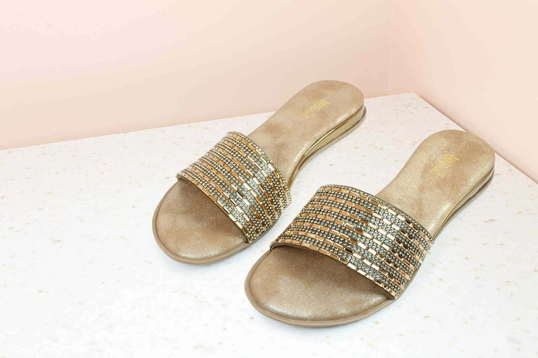 No heels, great comfort, and nicely studded jewels, just the style you need at a reasonable price. These Jewel Flat Mules look very contemporary and are perfect partners to complete your ethnic look. They come in ant gold colour. Wear them at weddings & gatherings and nail that ethnic getup. These flat mules are comfortable for your feet as well. They look very stylish and go with all your traditional looks.