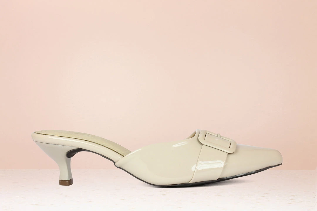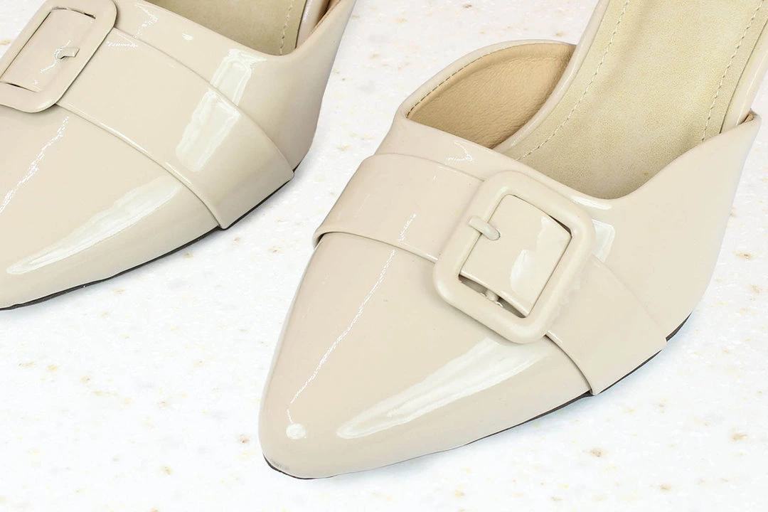 We are always excited to present our patented style. This patented style comes with a front buckle and small heels. They look extremely stylish and you can wear them with all your formal wear. Be it pantsuits, skirts or even indian formals, this style will be a perfect fit. It has a closed toe that looks very polished. So, get them and make them a part of a formal wear wardrobe. This style is available in Beige color which also is patented.