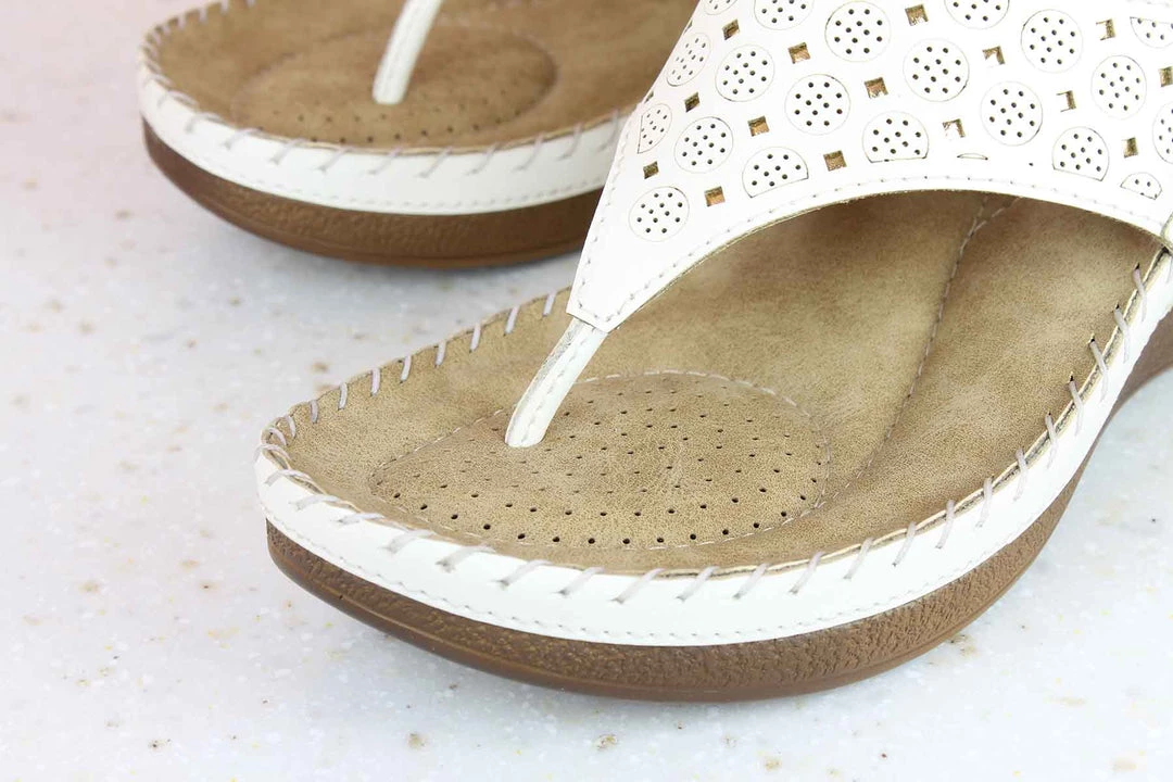 Comfortable platforms with just a hint of panache. These platform thongs are perfect to wear with your ethnic as well as casual and formal wear. The platform heels make your feet comfortable and the simple classy design makes it a very smart choice as well. The base color is brown and the thong is in white color. There is a delicate design on the thong which is very subtle yet pretty.