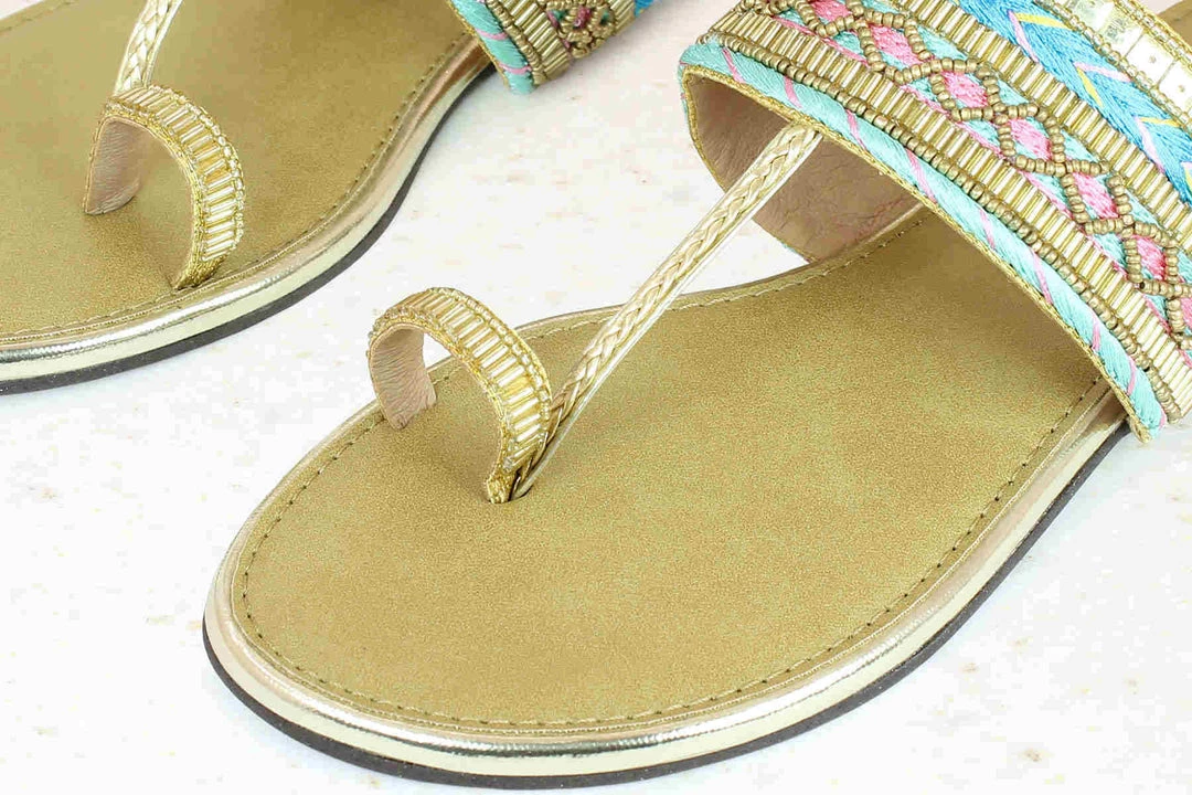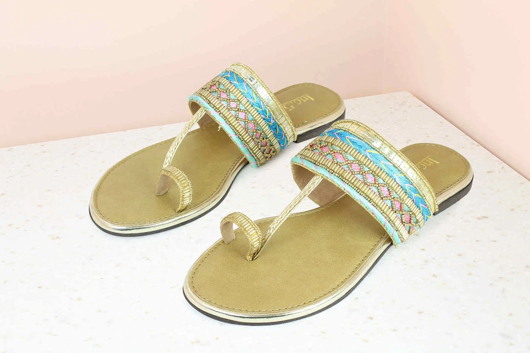 Embroidered Toe Thongs, doesn’t it give a rich feeling? And you can experience it with Inc 5. These toe thongs are making a come back for all the right reasons. Pair them with all your ethnics and get ready to look gracious. The straps feature embroidery which adds flavour. It is here to complement all your wedding looks. They are available in gold colour. The price is reasonable too.