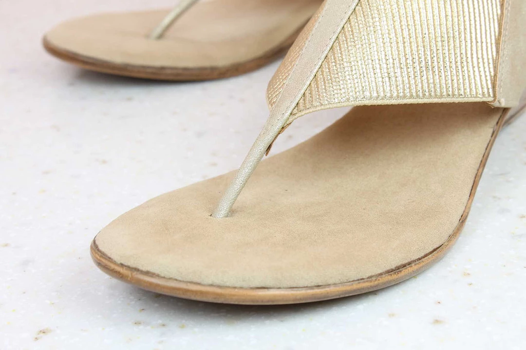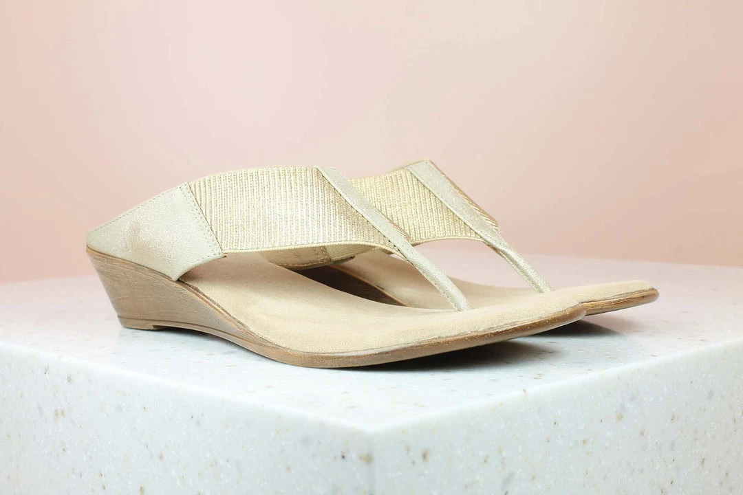 These wedge styled thongs are the perfect footwear for all your evening parties. They go very well with all the party dresses. They are elegant and classy yet very comfortable because of the small heels. They are affordable and available in gold color.
