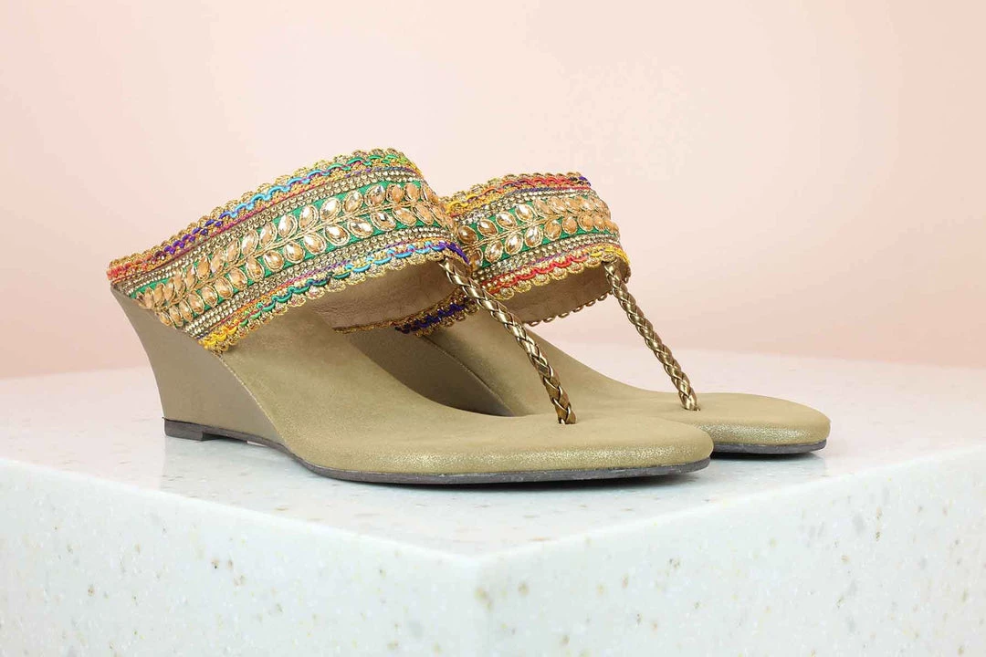 A reflection of Indian art and ethnicity, these wedge sandals look so elegant. They have a small heel so that they don’t hurt your feet. They have a beautiful design on the wedge straps which looks extraordinary. It’s multicolor as well! So, bring on all your sarees, dresses and other ethnic outfits, these sandals will pair up with everything. They are lightweight and reasonably priced as well. They are available in ant gold as the base color.
