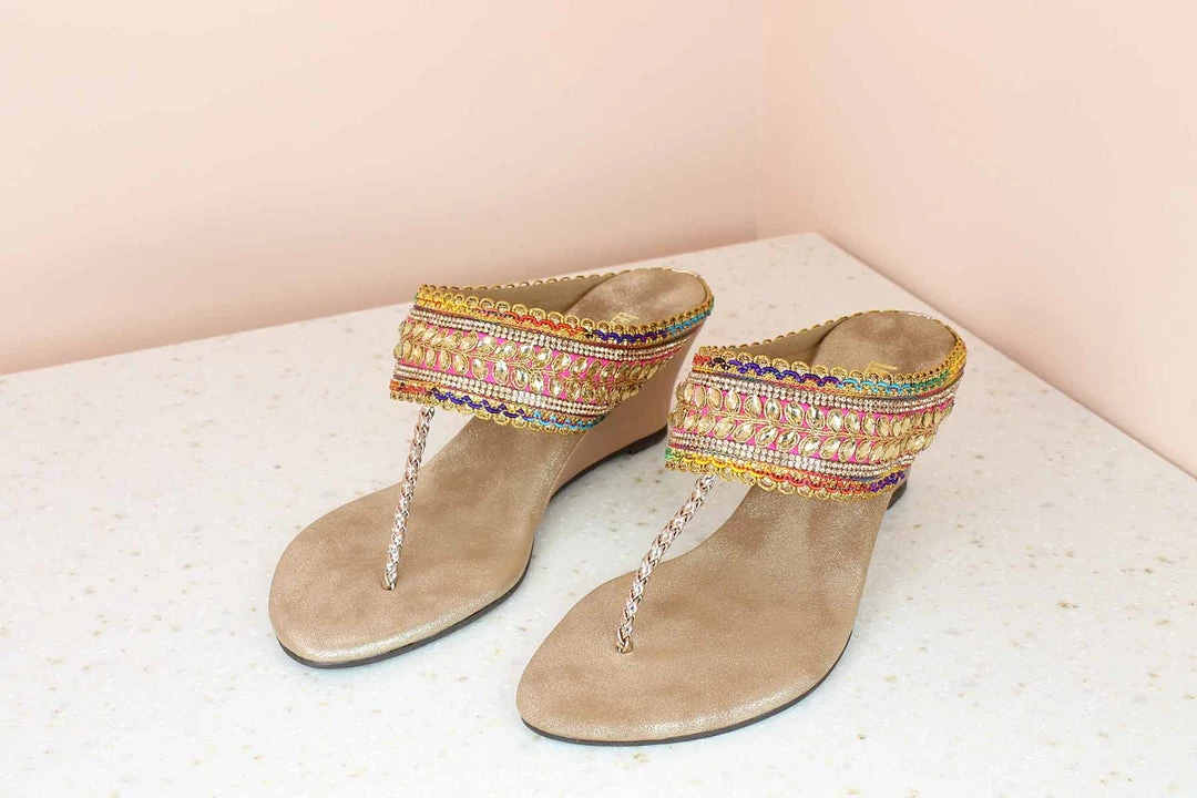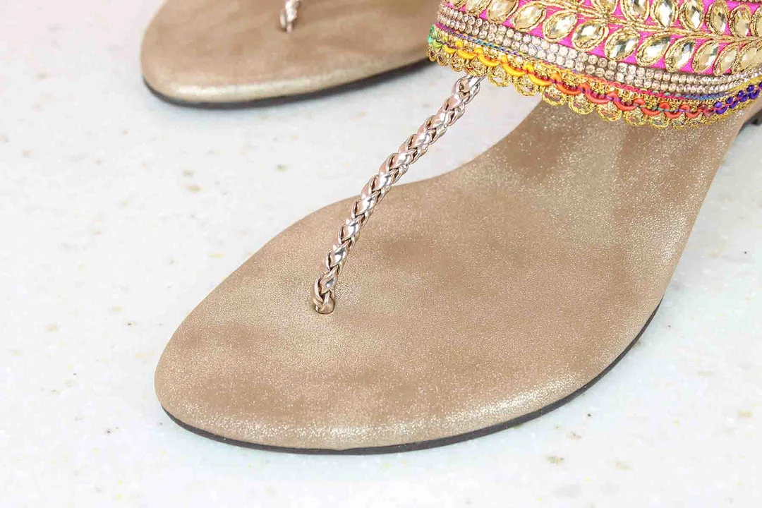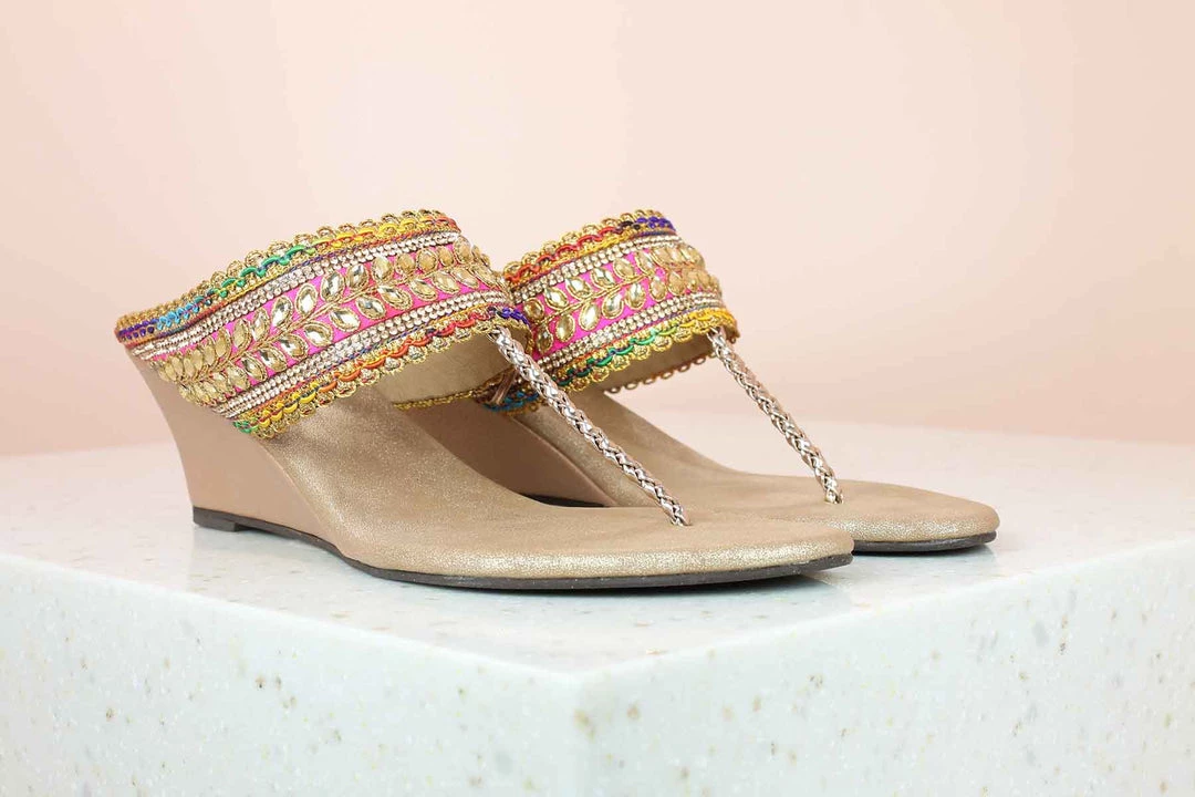 A reflection of Indian art and ethnicity, these wedge sandals look so elegant. They have a small heel so that they don’t hurt your feet. They have a beautiful design on the wedge straps which looks extraordinary. It’s multicolor as well! So, bring on all your sarees, dresses and other ethnic outfits, these sandals will pair up with everything. They are lightweight and reasonably priced as well. They are available in Rose Gold as the base color.