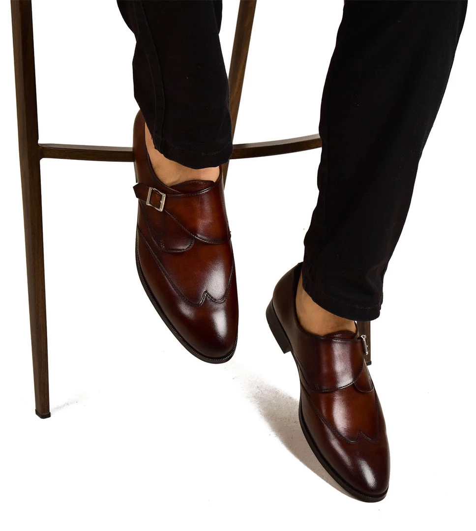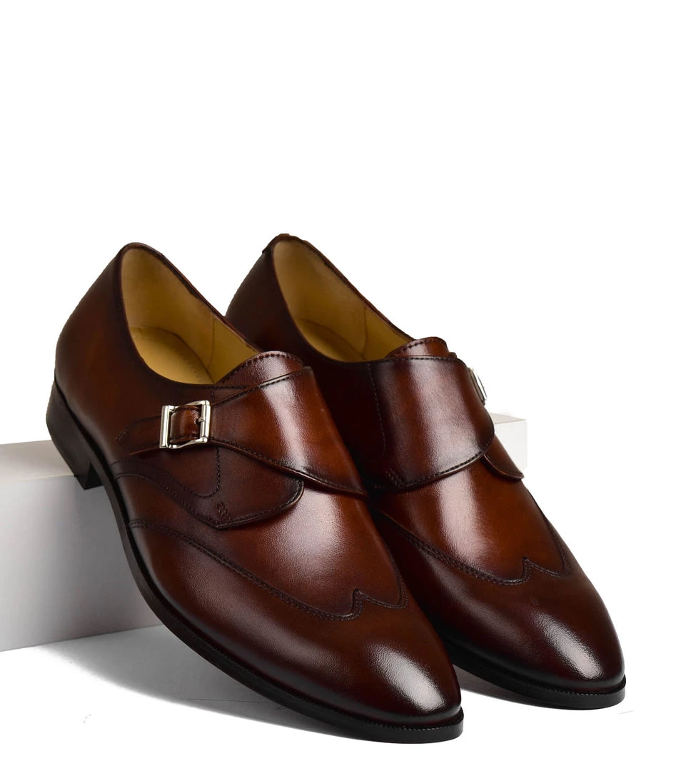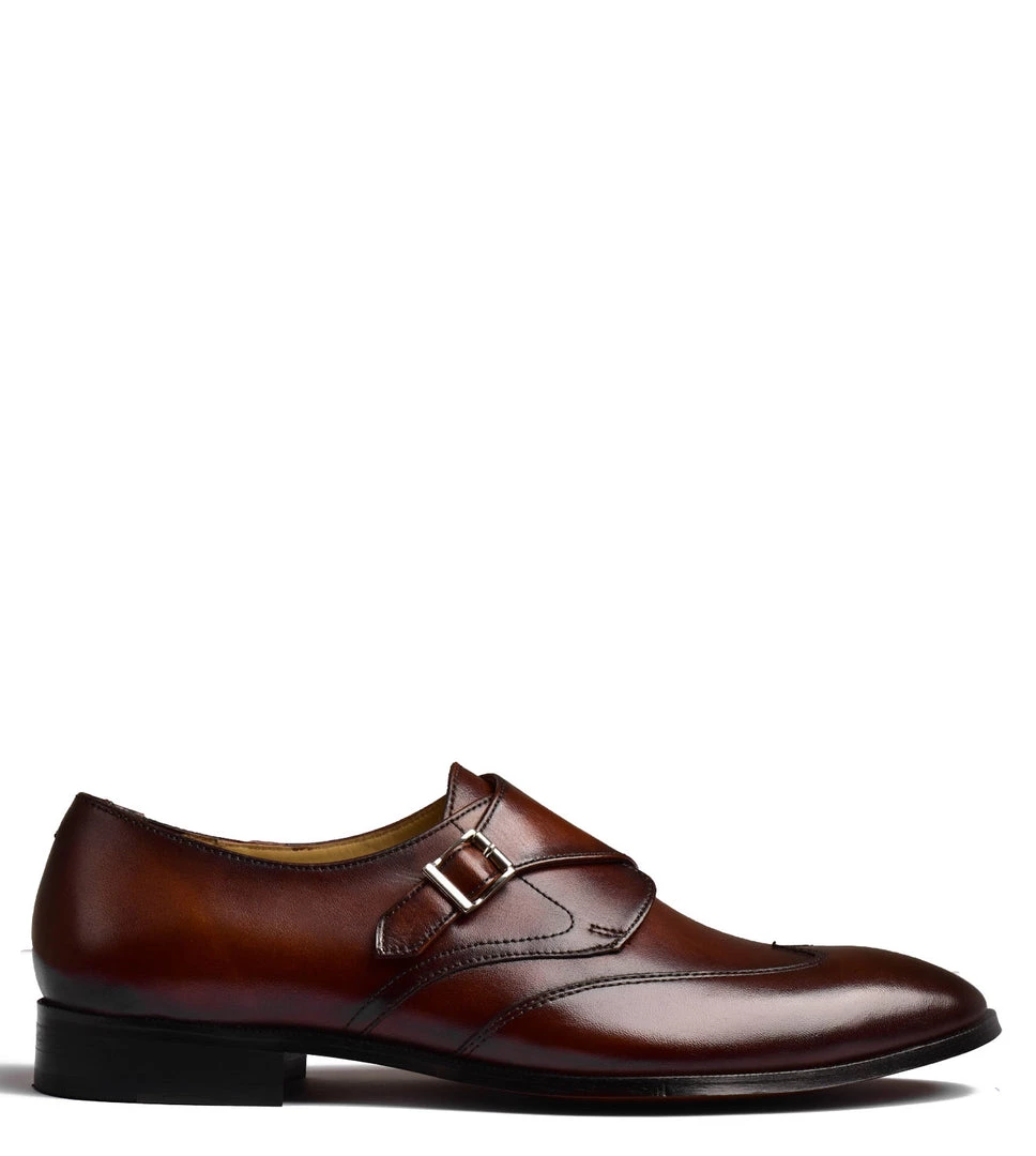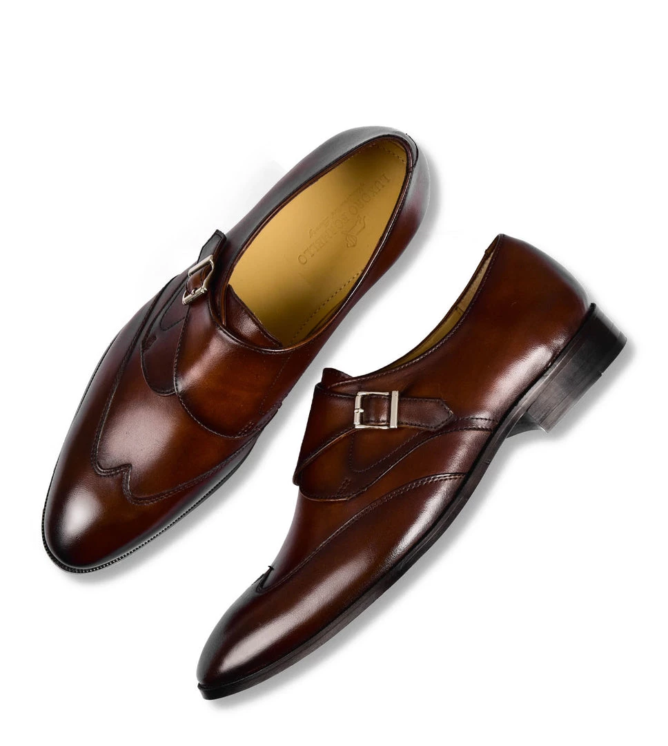 The The Ondario II is a sleek, mixed media single buckle monk strap with a stitched wingtip. The front buckle sweeps back to create a bold modern look. The toe and vamp, crafted with our hand-painted leather, is accented by the rich finish. The The Ondario II features our Alivio construction where the leather is wrapped around the feet for unparalleled comfort.