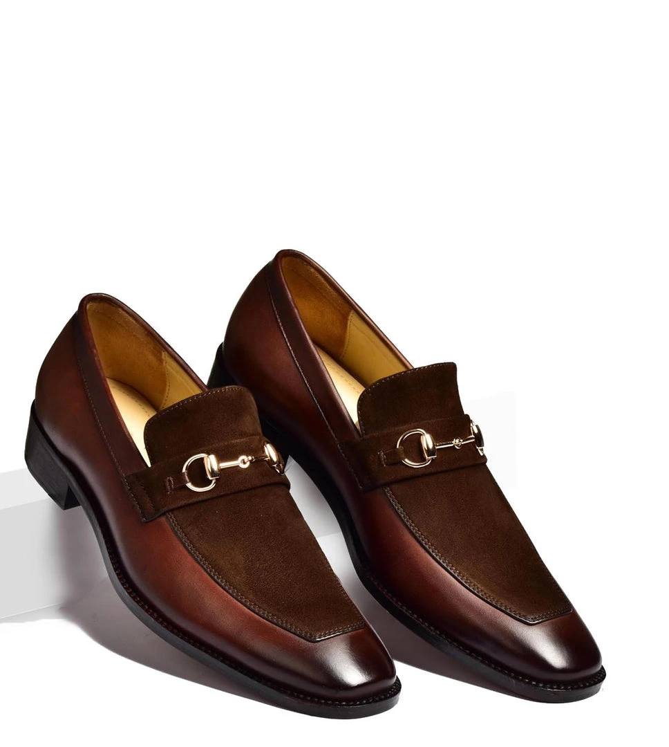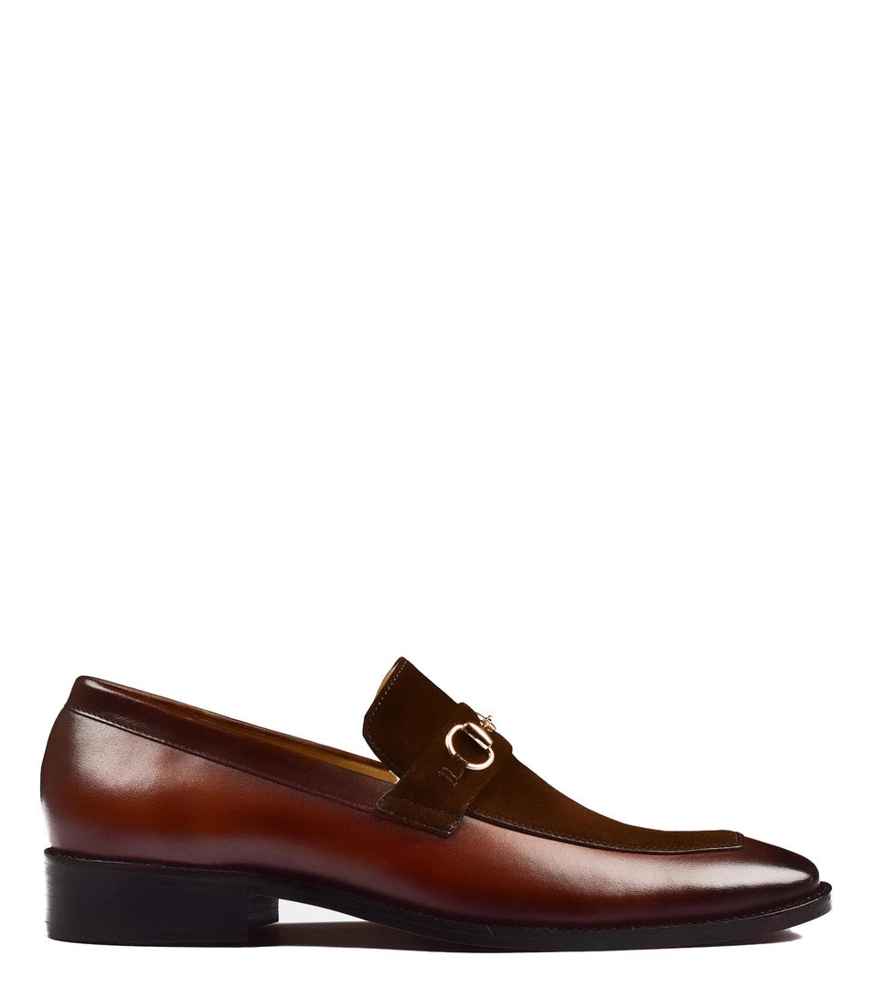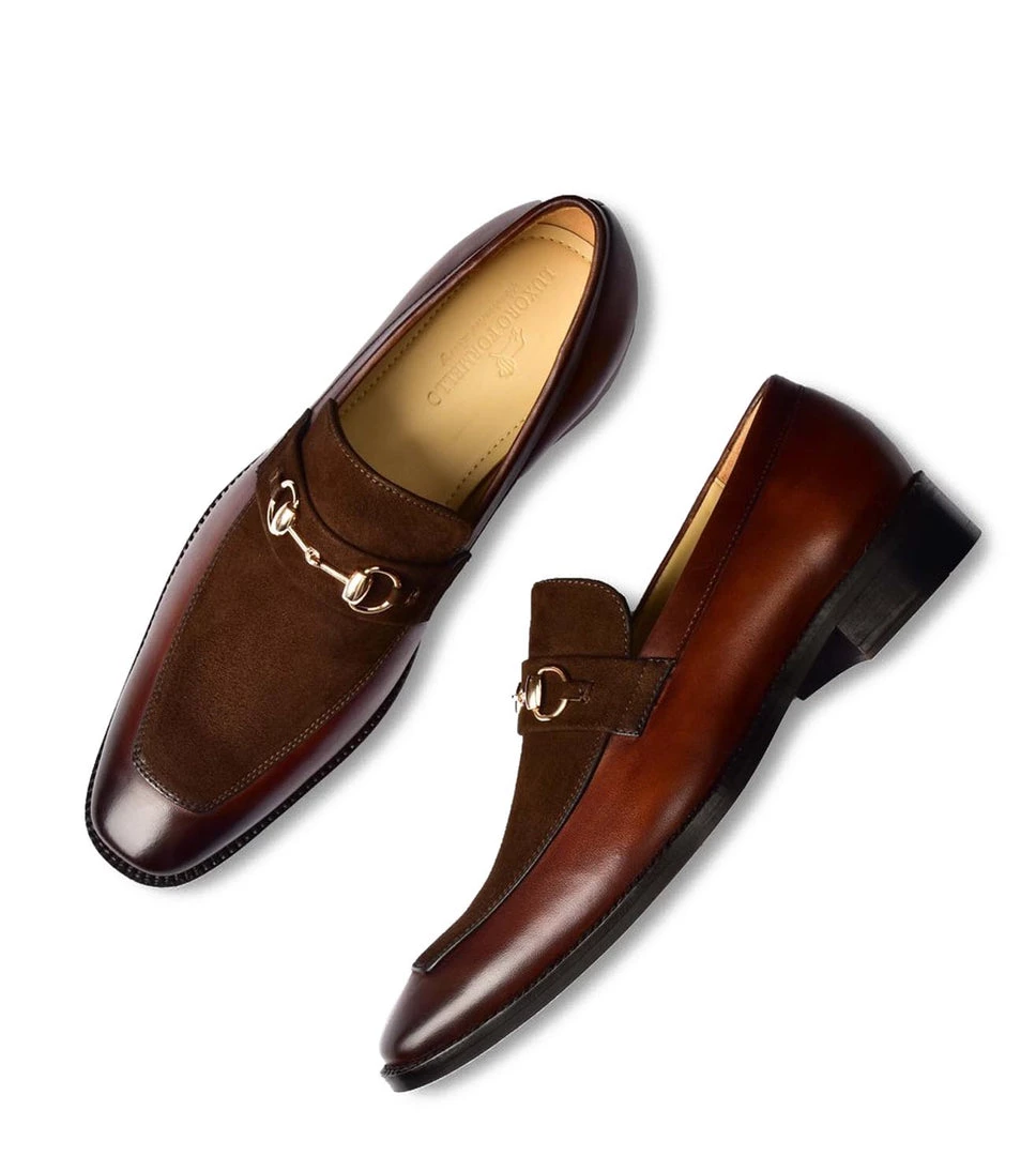 Martin Borman is a slip on bit loafer crafted on an updated last. It features a tapered apron toe shape and a close bordered stitch sole to create a clean and elegant silhouette. Adorned with Hand-Patina Leather and Brown suede Leather accents, This classic loafers delivers an elegant option for any closet.