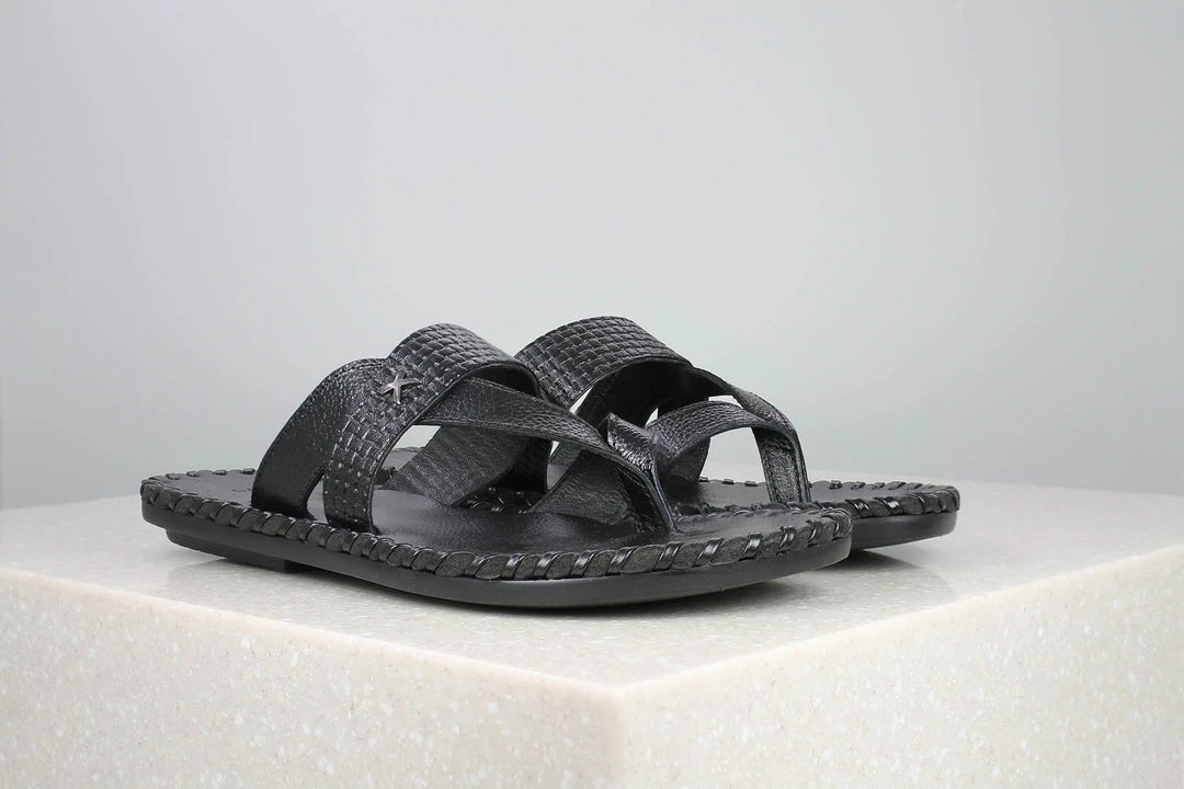 You have probably landed here because you were looking for something casual and comfortable. Yes, these Embossed Rope Thongs are one of the most comfortable slippers you will ever wear. The overlapping straps feature embossed patterns on one side and a toe ring. They are available in black colour.