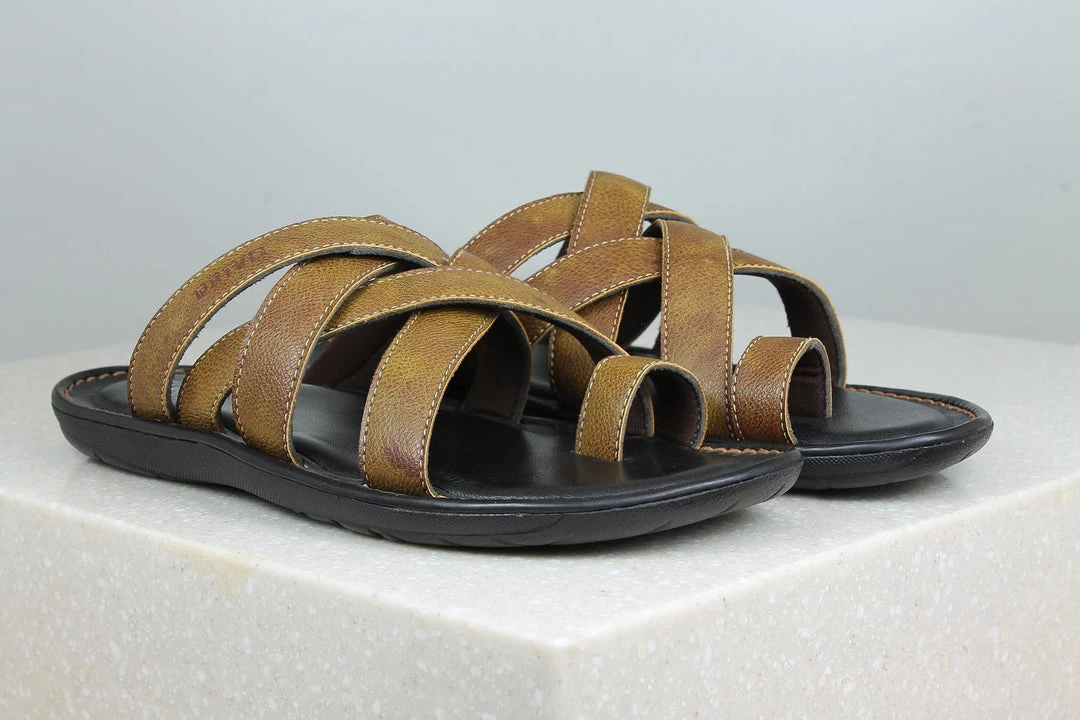 Smart leather straps top off with one toe a casually cool slipper with versatile appeal available in tan.