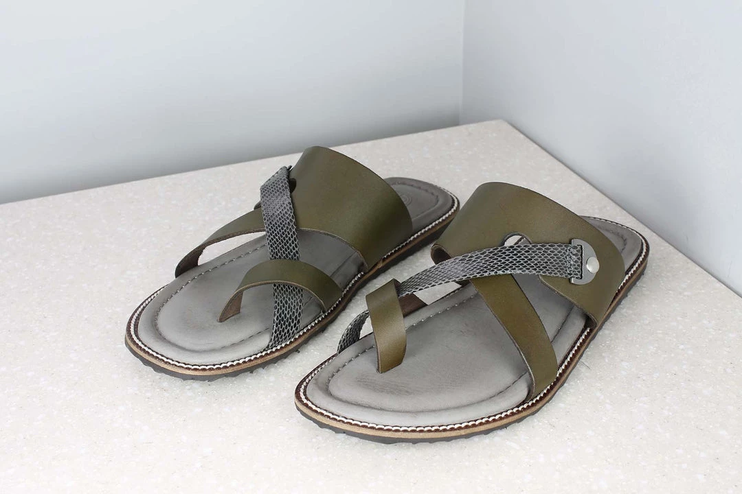 What is comfortable and light? These Toe Thongs! They are casual slippers with flat soles and are held by a strap in the centre. Made from leather, these Toe Thongs offer great comfort and are designed to look likewise. They come in mehendi colour. A must-have in your collection “